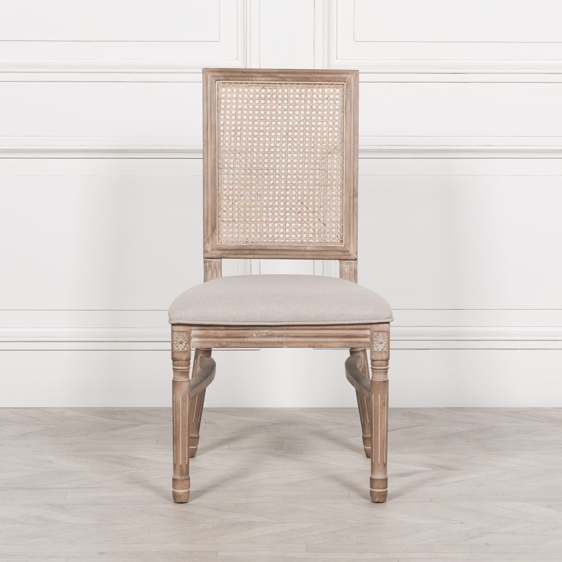 Wooden Louis dining chair in wooden finish with wood washing added to the detail of the frame. The back rest is a square shaped back finished in rattan. The seat pad is linen upholstered. Dining chair is stackable.